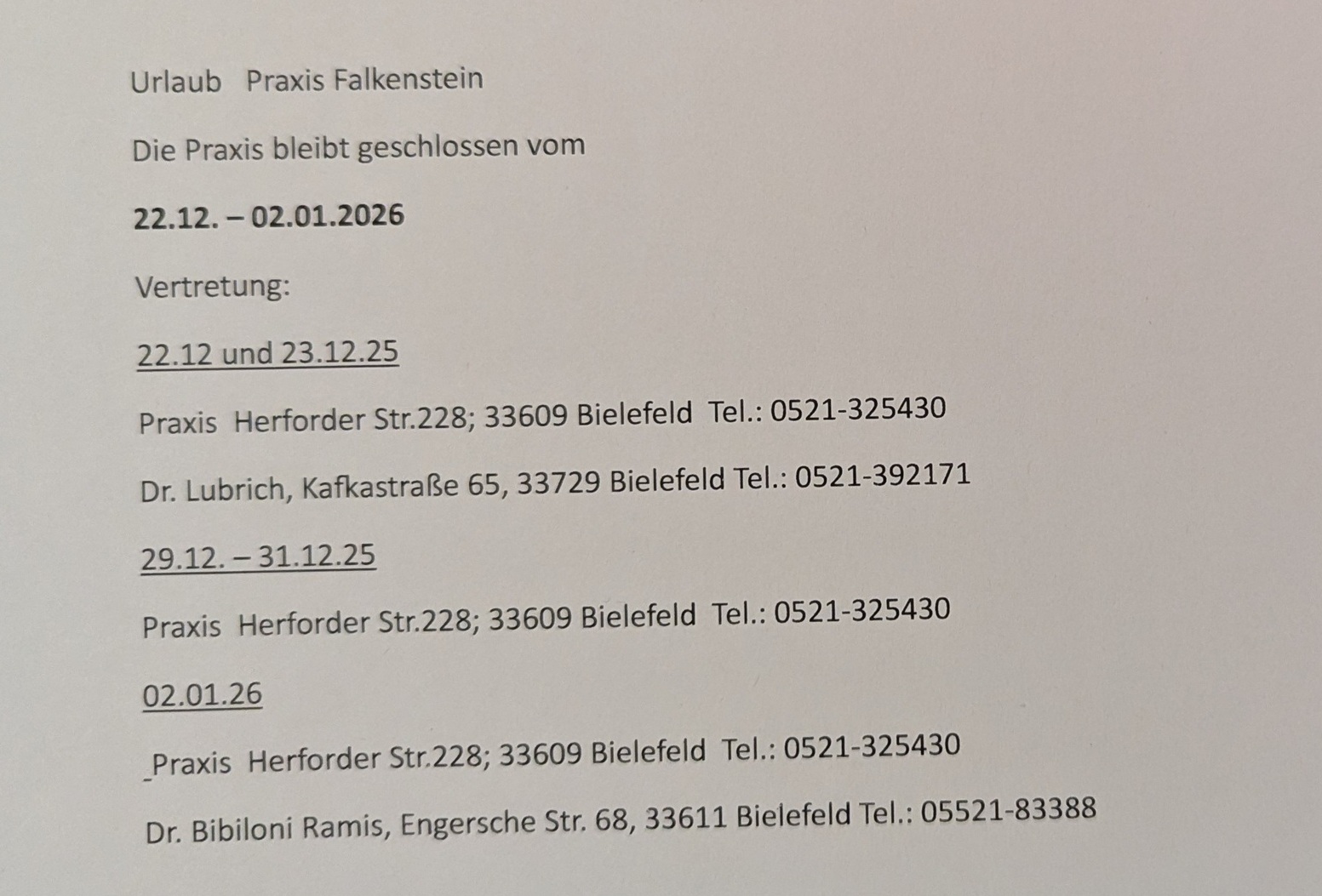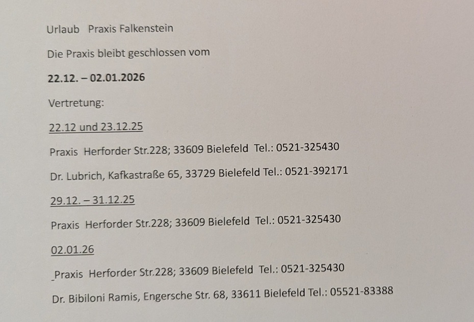 | Winterferien: 23.12.2026 - 1.1.2027 Praxis geschhlossen | |